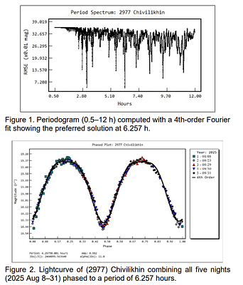 The Minor Planet Bulletin (MPB) call list is a key resource for astronomers to identify asteroids that are due for observational campaigns. When (2977) Chivilikhin appeared on the list for its 2025 apparition, I decided to measure its lightcurve again,...