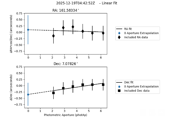 Figure 2 illustrates how I used the aperture-dependent RA and Dec measurements, along with the linear extrapolation used to derive the zero-aperture astrometric solution.
